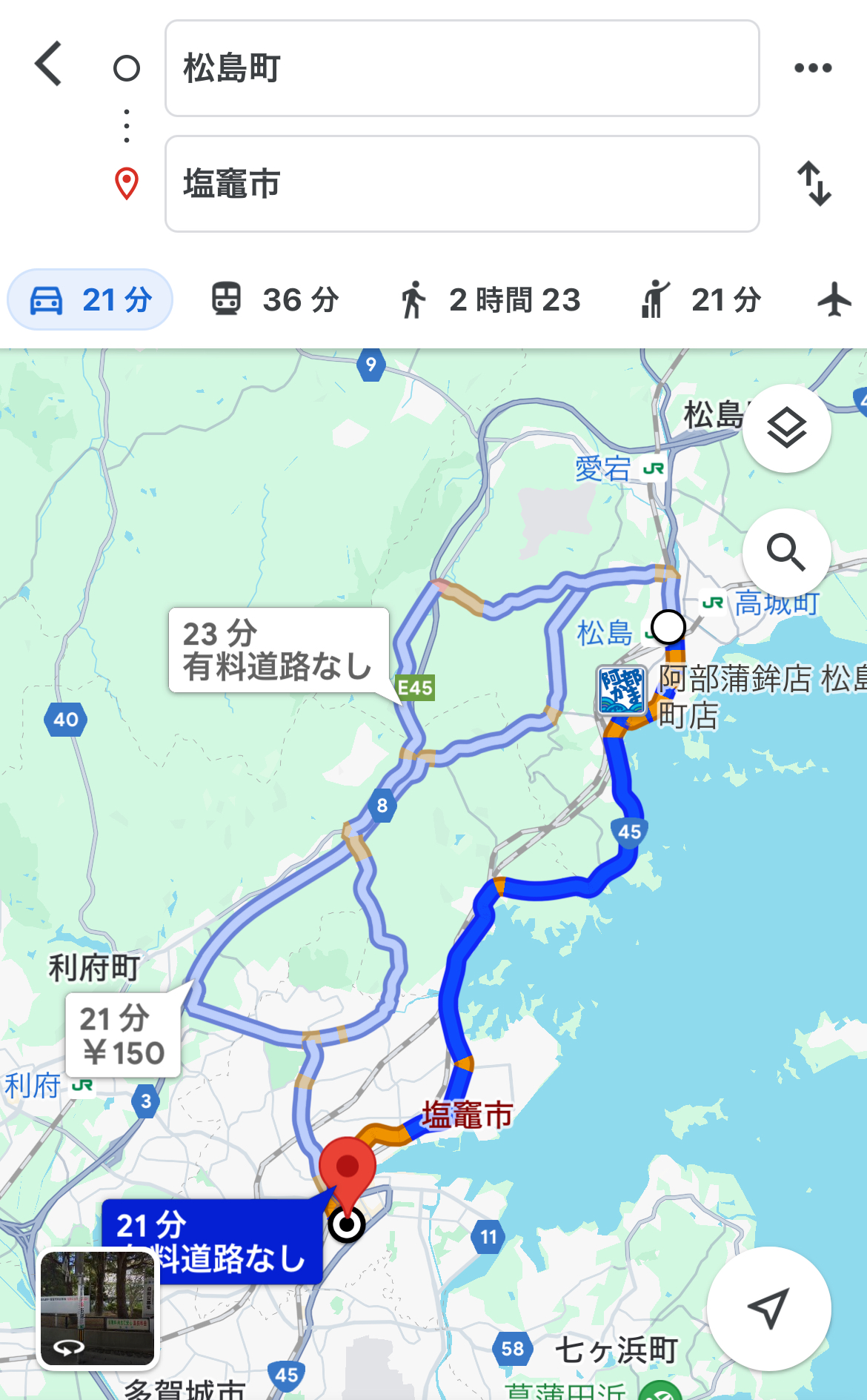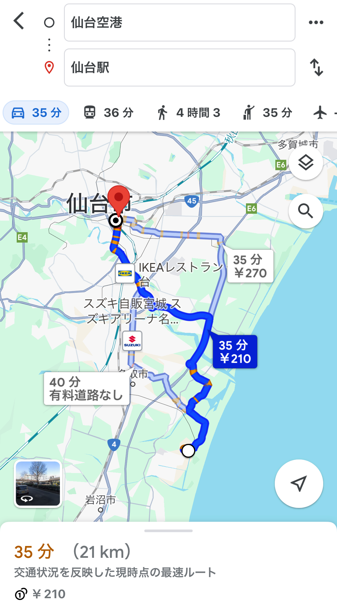 空港から仙台駅まで電車で移動すると1人660円(所要時間25分)で、レンタカー移動であれば約200円(30分程度)+ガソリン代(21km分)です。仙台駅周辺のレンタカー店でレンタカーすることも考えましたが今回は2人で移動することを考えた際に金額的にも安く、また仙台駅周辺だけの観光ではなく郊外観光がメインであったこともあり仙台空港近くでレンタカーを借りることにしました。