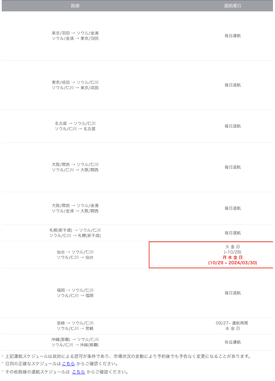 アシアナ航空 日本路線運行スケジュール